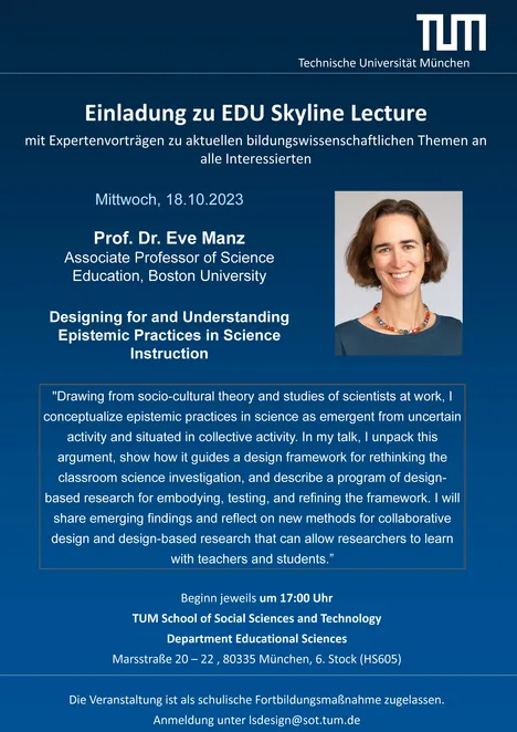 It is a pleasure to invite everyone to our next skyline lecture of Prof. Dr. Eve Manz, Associate Professor of Science Education at Boston University Wheelock College of Education & Human Development, Wednesday October 18 at 5 pm in the lecture hall on the sixth floor in Marsstrasse.